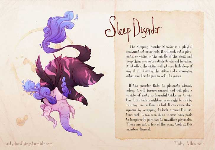 El monstruo del Desorden del Sueño es una criatura juguetona que nunca descansa. Tratará de buscar a un compañero de juegos en medio de la noche y mantenerlo despierto para saciar su eterno aburrimiento. Muy a menudo, la víctima dormirá poco o nada, estresándose y fomentando que otros monstruos se unan al del Desorden del Sueño en sus juegos.