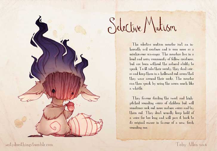 El monstruo del mutismo selectivo no es una criatura inherentemente malvada sino que es más un carroñero travieso. Viven en una comunidad de ruidosos y gritones compañeros, pero nacen sin la habilidad natural de hablar. Para ser aceptados en su sociedad roban voces y las guardan en una bellota ahuecada que se cuelgan en su cuello. El monstruo luego puede hablar usando la bellota como una especie de silbato.